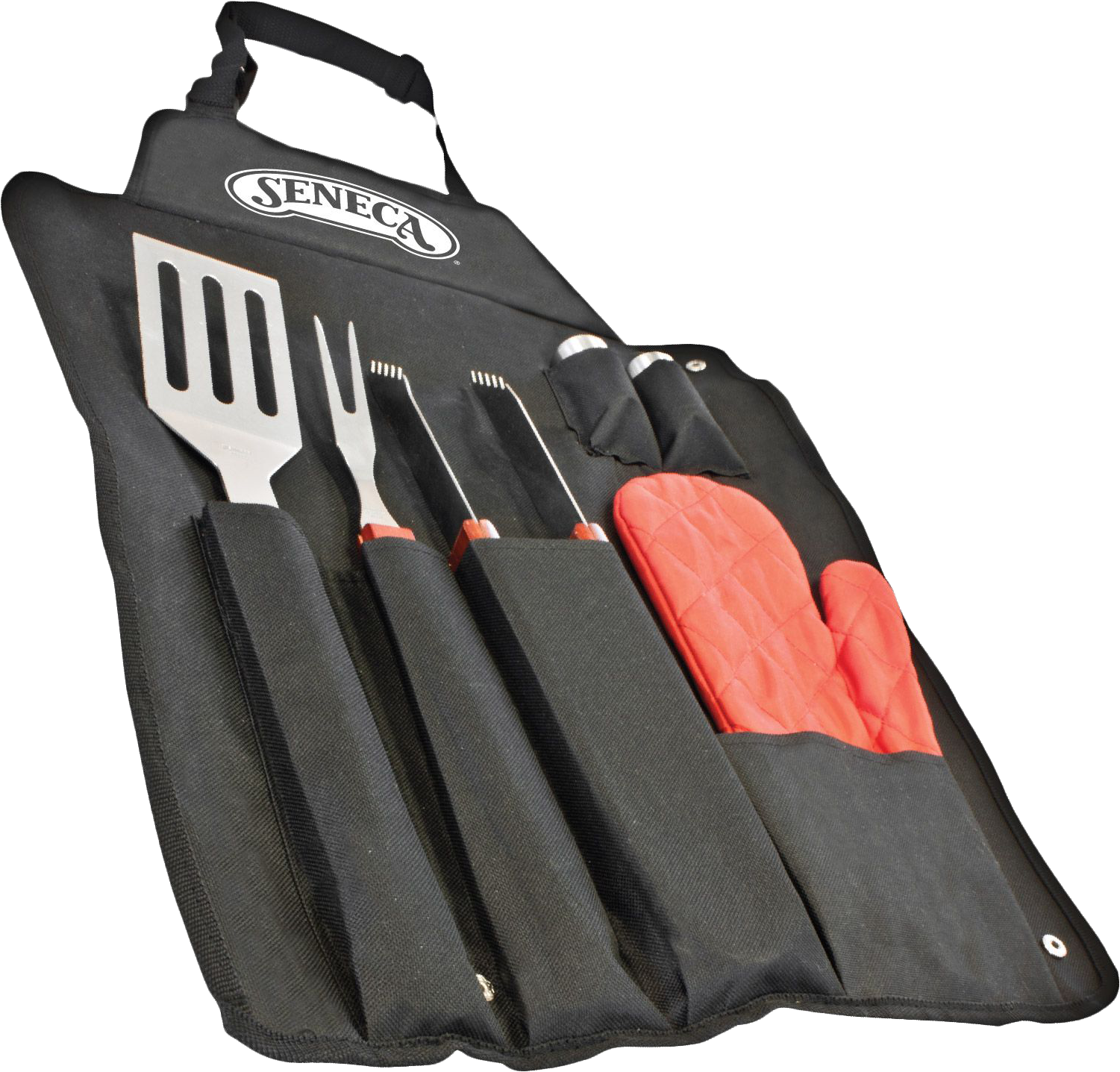 Ready to BBQ in style? Me too! Here's a gift set that is sure to please! A BBQ apron and toolset are perfect for anyone who is ready to take on the grill! Includes a slotted spatula, long reach BBQ fork, sure grip tongs, oven mitt, salt & pepper shakers, and a heavy gauge nylon apron with adjustable locking fastener. All tools are made of professional-grade steel with solid wood handles, and the tools fold neatly into the apron for compact storage or travel. Make anyone a grill master with this gift set!